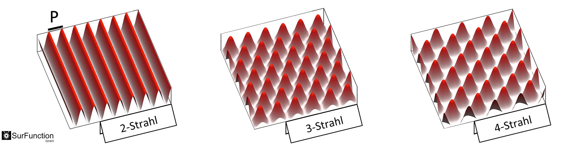 The laser interference phenomenon is based on the interaction of overlapping electromagnetic waves, creating intensity patterns that are projected onto the surface – without altering the material itself. The number and arrangement of beams determine the resulting pattern, which can be configured as lines, grids, dots, or virtually any periodic surface design.